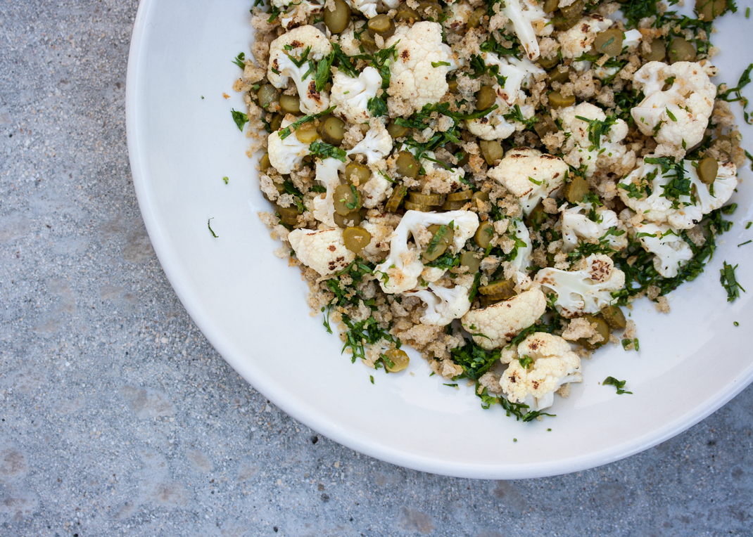 Add the cornichons, parsley, lemon juice, and 1 ½ tablespoons of the olive oil to the bowl with the cauliflower and toss gently to combine. Season with salt and pepper and garnish with toasted bread crumbs.
