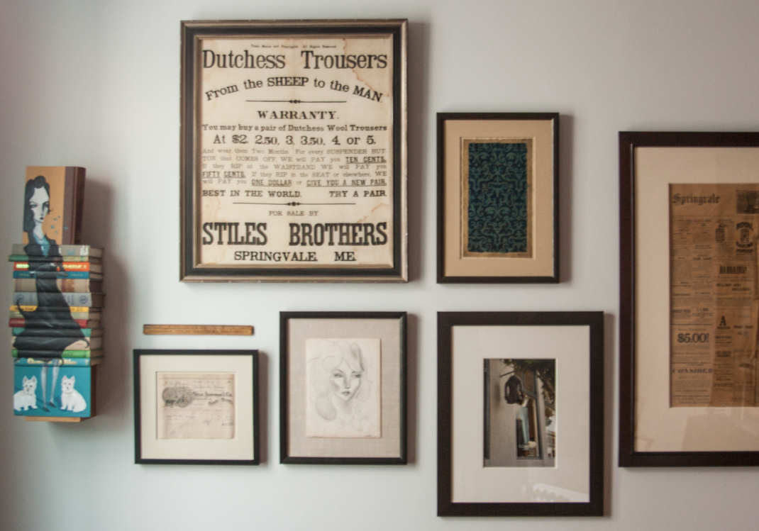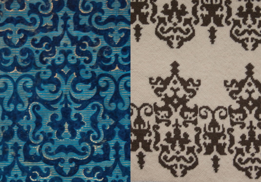 I love to experiment with colors and patterns. Recently, I created two needlepoint canvases from a vintage damask print I acquired at Jayson Home and Garden. The print adds a touch of color and pattern to the gallery wall in our library. Although damask fabric is traditionally woven with elaborate floral or geometric designs, I prefer to recreate the geometric damask pattern slightly off center or incomplete. The ivory and black damask needlepoint above features the damask in the bottom left corner of the canvas with an incomplete pattern. The ivory and brown needlepoint below features a complete albeit off center damask pattern.