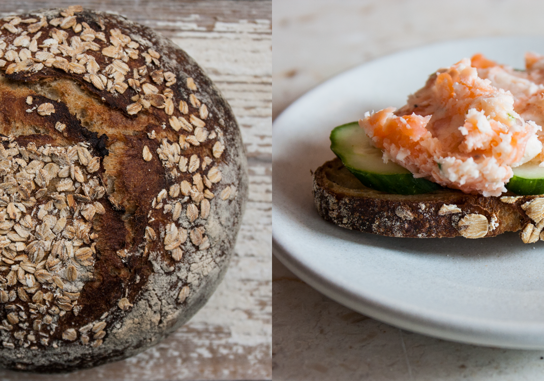 My husband and I arrived home from the master class at Publican Quality Bread with three loaves of artisan bread. It is a special treat in our house to have an abundance of bread. The next evening, I prepared salmon rillettes to complement a sprouted oat boule. Salmon rillettes, a flavorful combination of smoked and wild salmon, butter, and crème fraîche, are delicious served as an appetizer on cucumbers or crackers, or as a light dinner with toast and a simple salad.